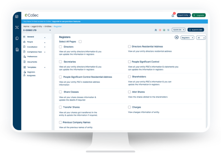 With CoSec Global, managing your company registers has never been easier. Take advantage of our user-friendly platform to keep your company records organized, updated, and compliant. Try CoSec Global today and experience the convenience and efficiency of our register management features.